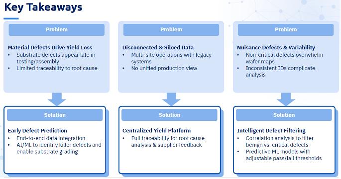 Material defects appearing late: By using end-to-end data integration and machine learning, manufacturers can predict defect impact much earlier in the flow, identify killer defects, and enable substrate grading before wafers move downstream.